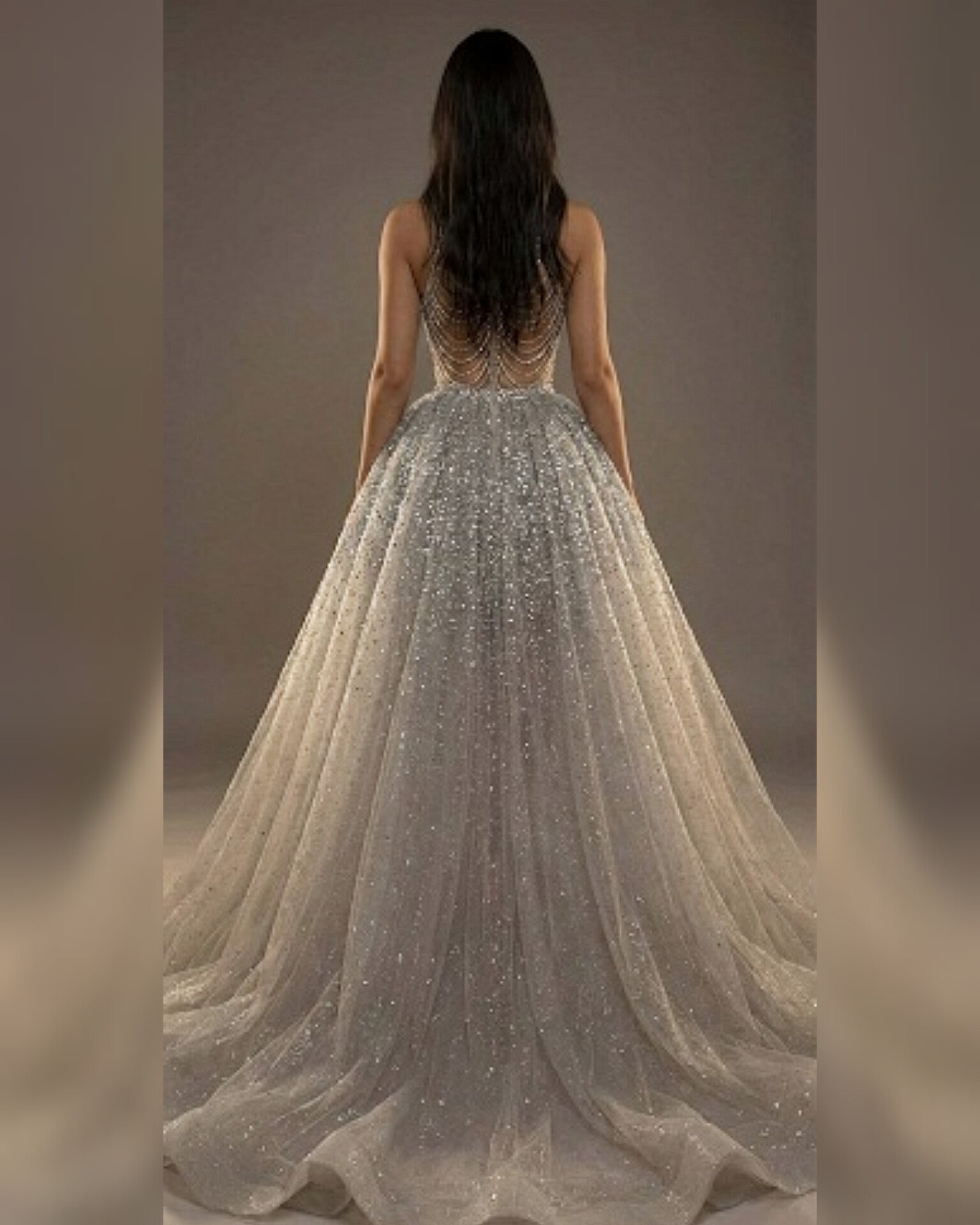 Intricate Artistry: Hand-placed sequins and beadwork create a seamless, liquid-silver effect.