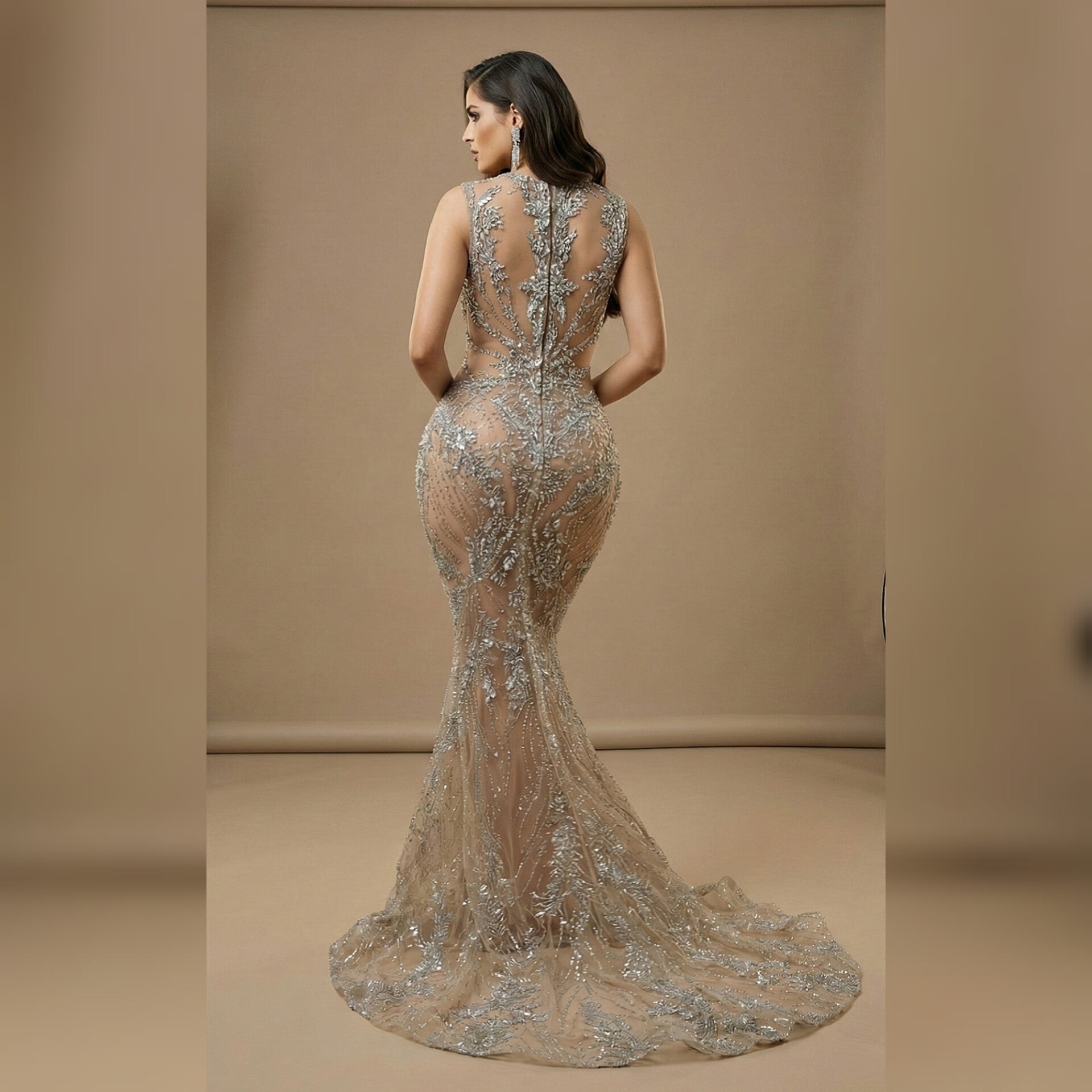 Transform into a vision of light with this breathtaking floor-length gown. Crafted from ultra-fine nude illusion mesh, this piece creates a "second skin" effect that allows the intricate silver beadwork and shimmering crystals to appear as if they are floating across the body.