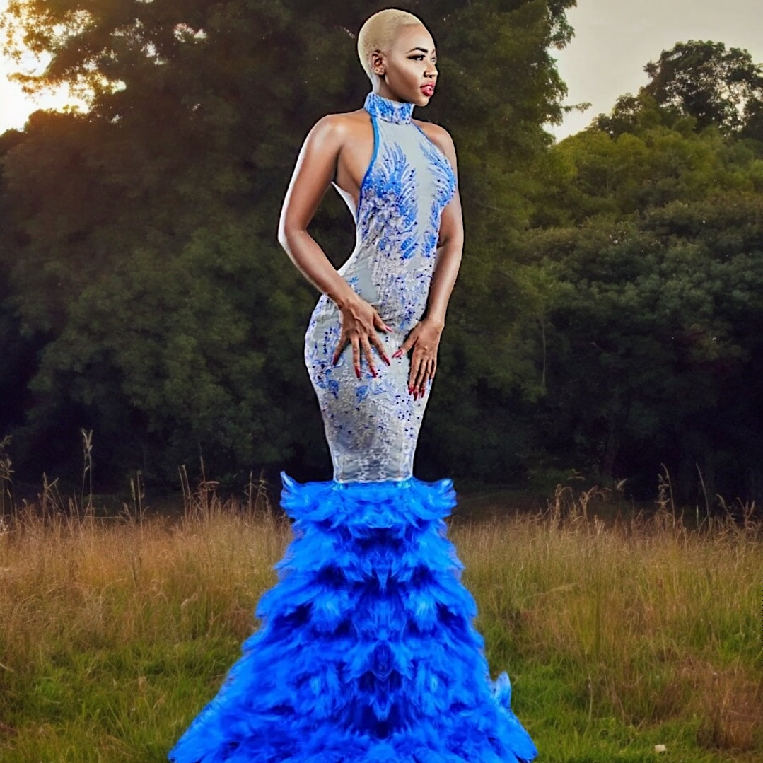 Step into timeless elegance with the Asimi Azure gown, a piece designed to make you feel like a true fashion icon. Featuring exquisite embroidery and delicate feather accents, this gown ensures you’ll command attention at any formal event.