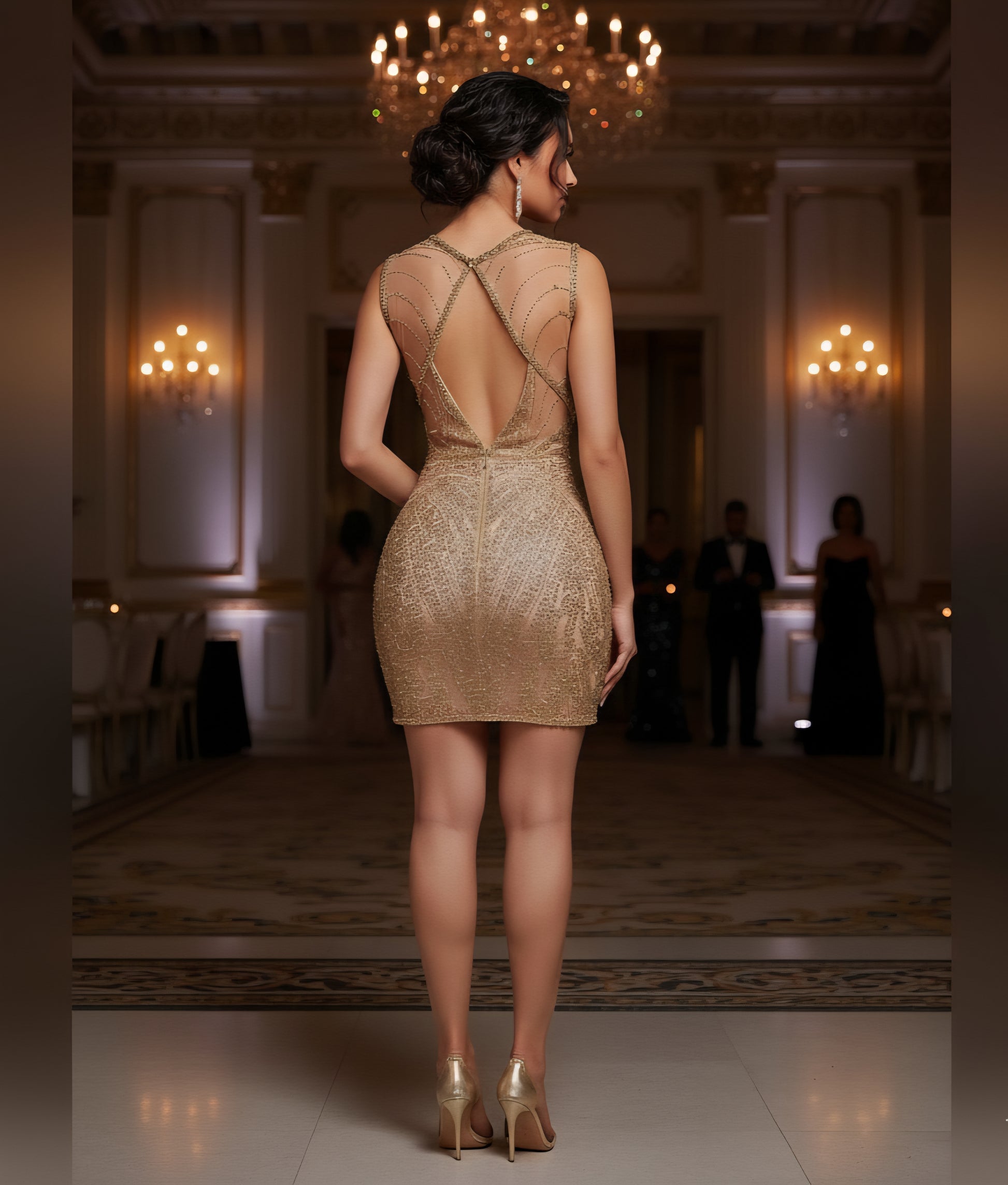 The Mecca Dress is made of rhinestones on sheer material with a shimmer glitter material or without lining with a skin tone mesh. The back of the dress is made of the same shimmer material open back with a zip closure and hooked at the top or a full closure coverage at the back. You have the option to add sleeves if needed. Please see images to see options
