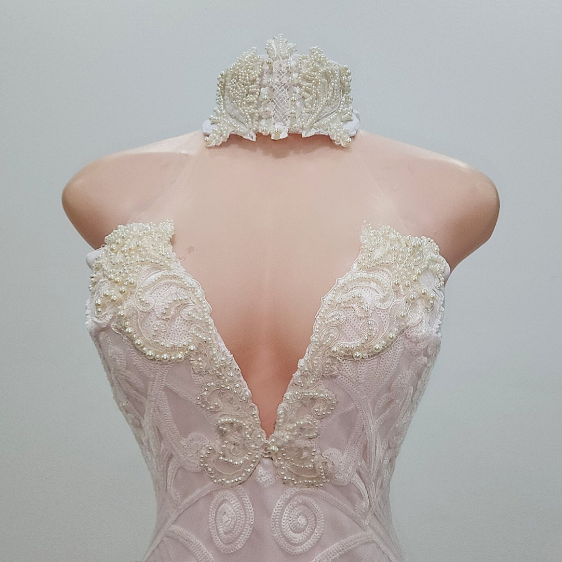 Introducing our exquisite pearl bridal dress – a stunning creation that is sure to make brides turn heads. This pearl wedding gown is designed with a touch of elegance, featuring beautiful pearls delicately placed at the neckline and bust area.