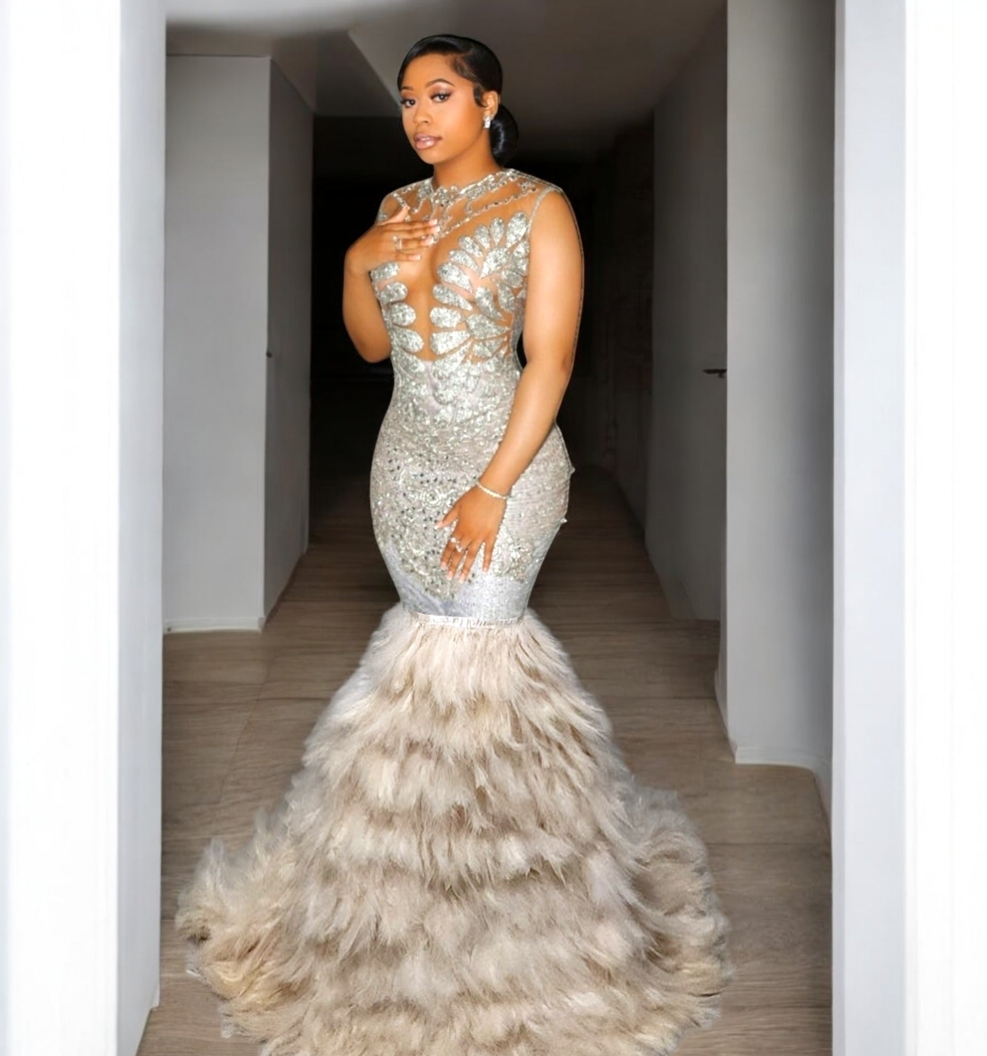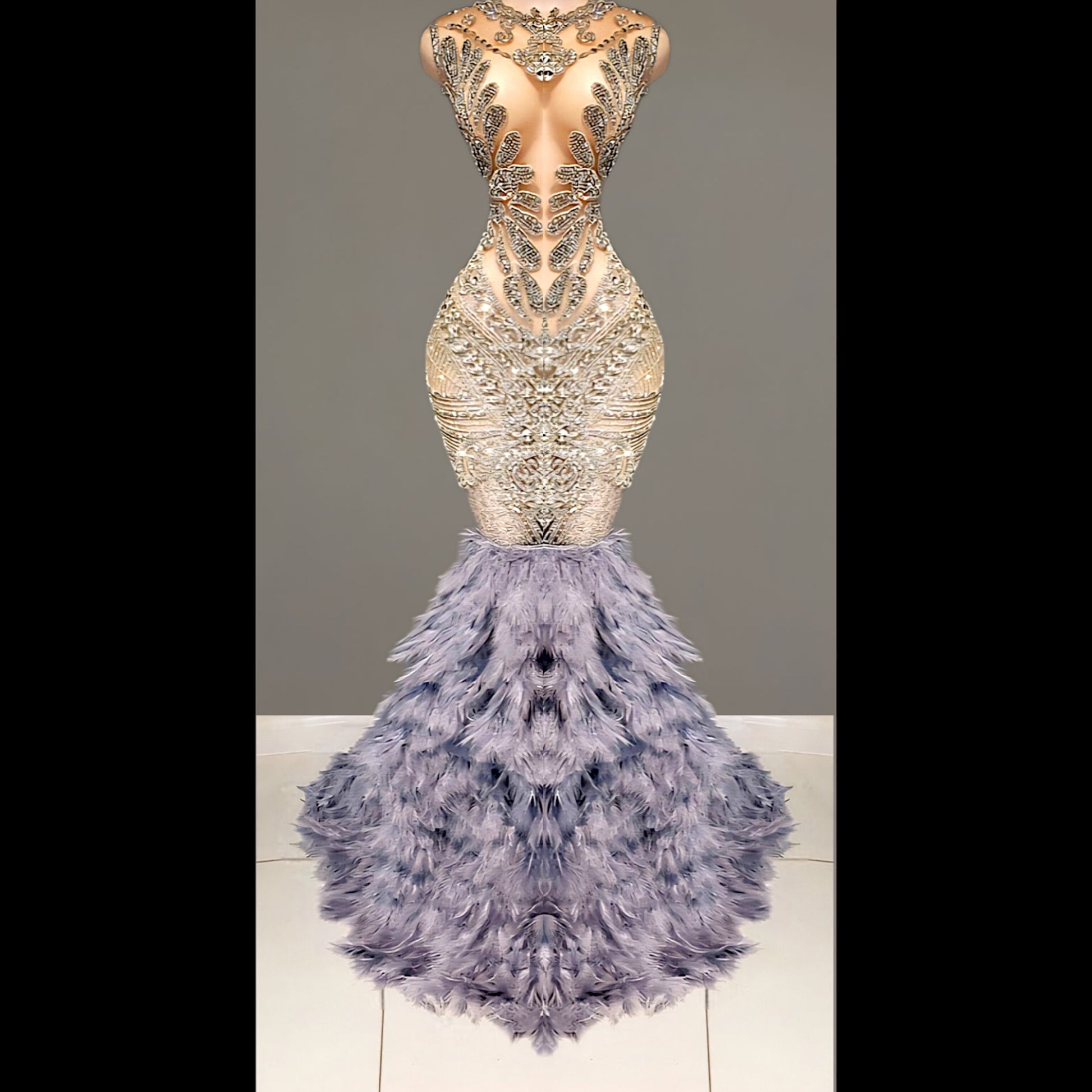 Crafted from a soft and lightweight feather material, this gown features a flattering mermaid silhouette that hugs your curves in all the right places. The intricate rhinestone detailing at the front adds just the right amount of sparkle to make you shine. Whether you're attending a wedding or prom, this mermaid gown with feathers is sure to make you feel like royalty. So why wait? Add it to your wardrobe today!