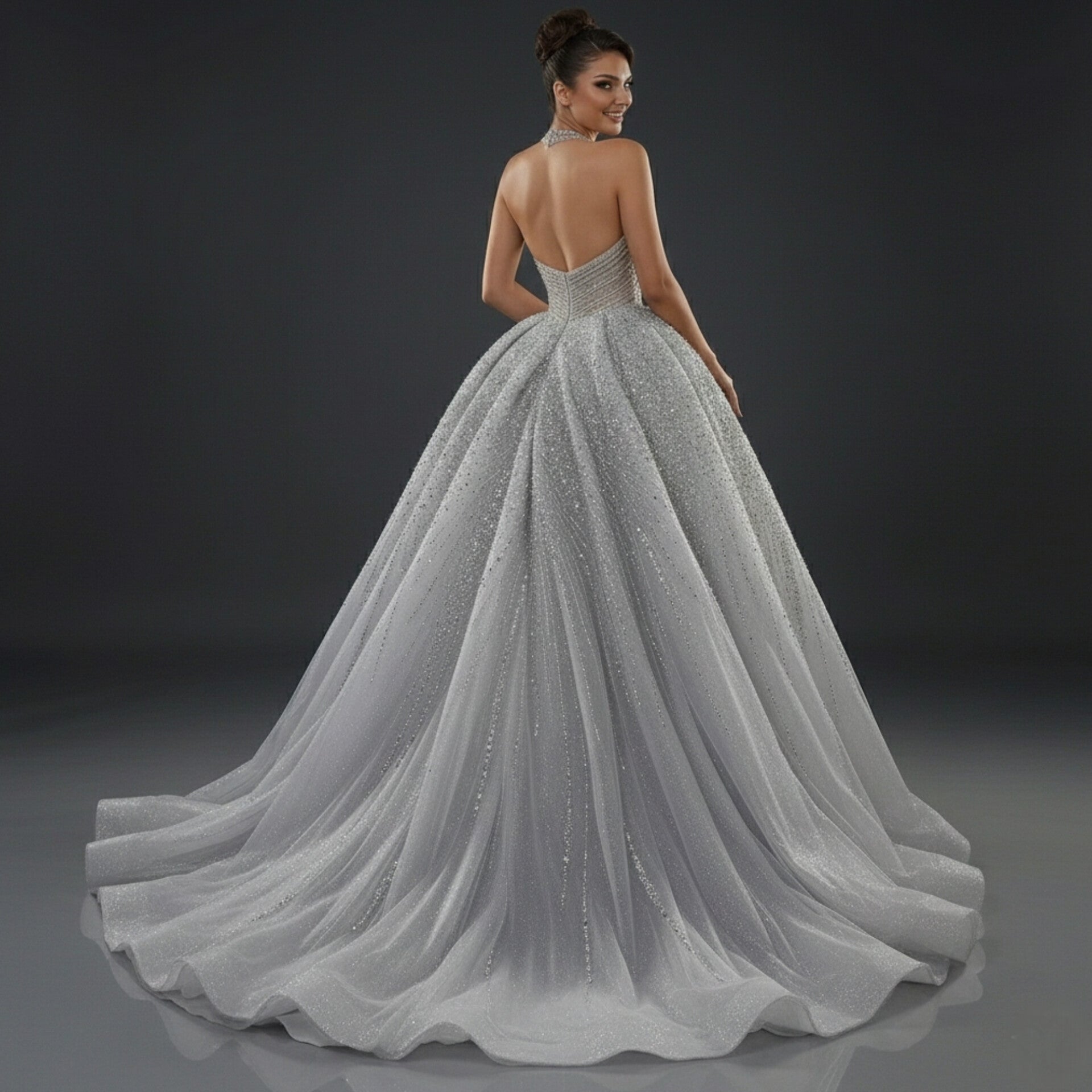 Voluminous Overskirt: The heavy-weight satin with tulle overskirt is dusted with shimmering glitter and sequins, flaring out from the hips to create a dramatic, royal entrance.