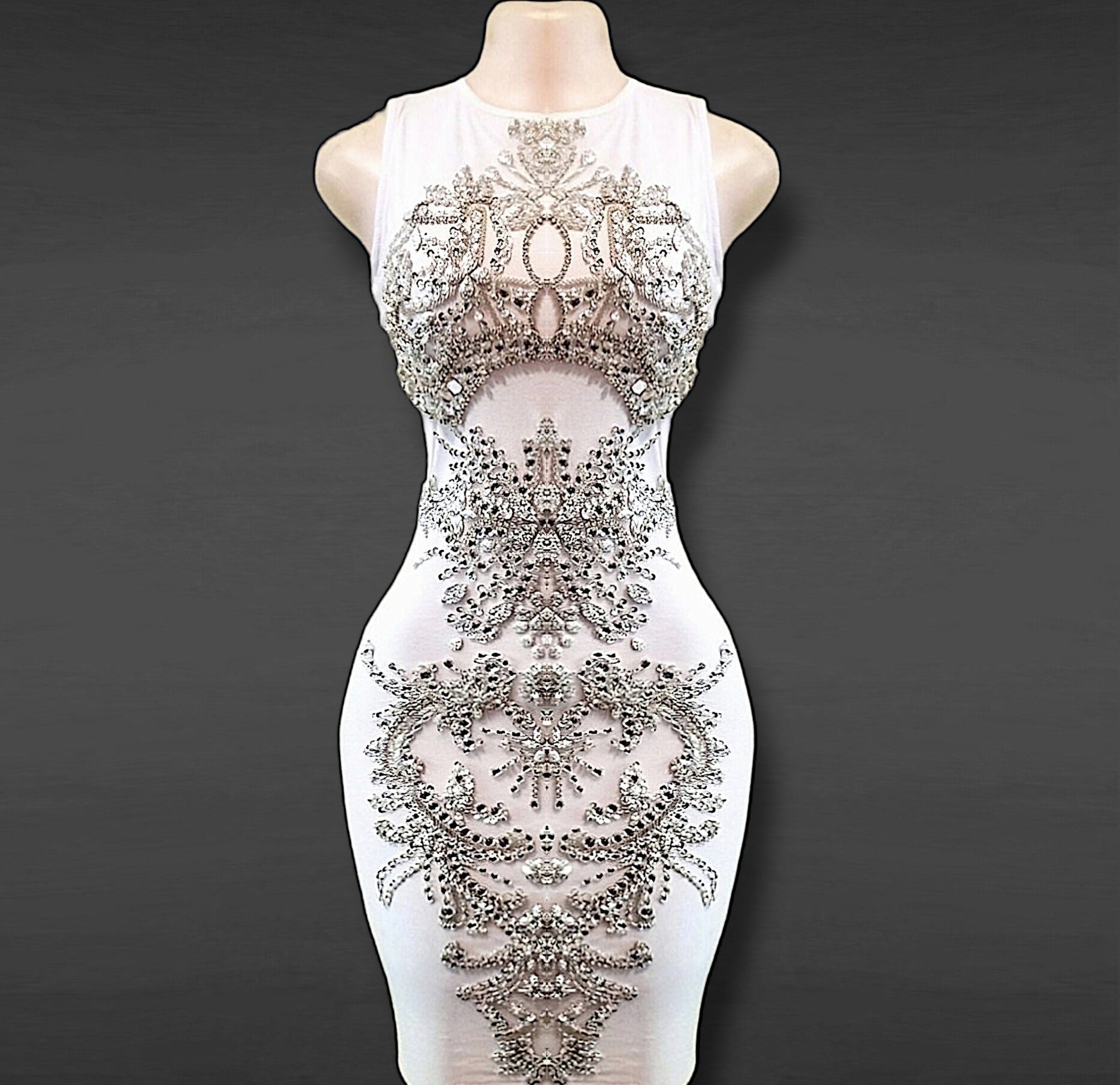 This dress is a stunning piece crafted from rhinestone-studded sheer material paired with a white solid fabric, creating a mesmerizing contrast.