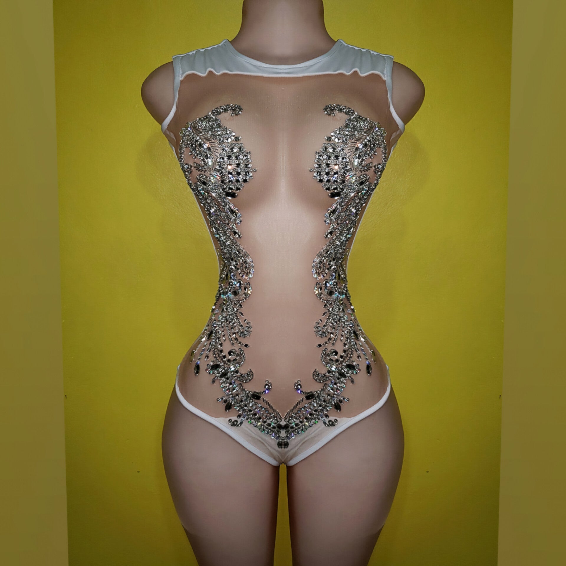 The Ellocin bodysuit is crafted to offer style and comfort. The front provides an eye-catching detail with an elegant and sexy look with well placed rhinestones. For versatility of comfort at the back we used a spandex material to allow you to move in style.