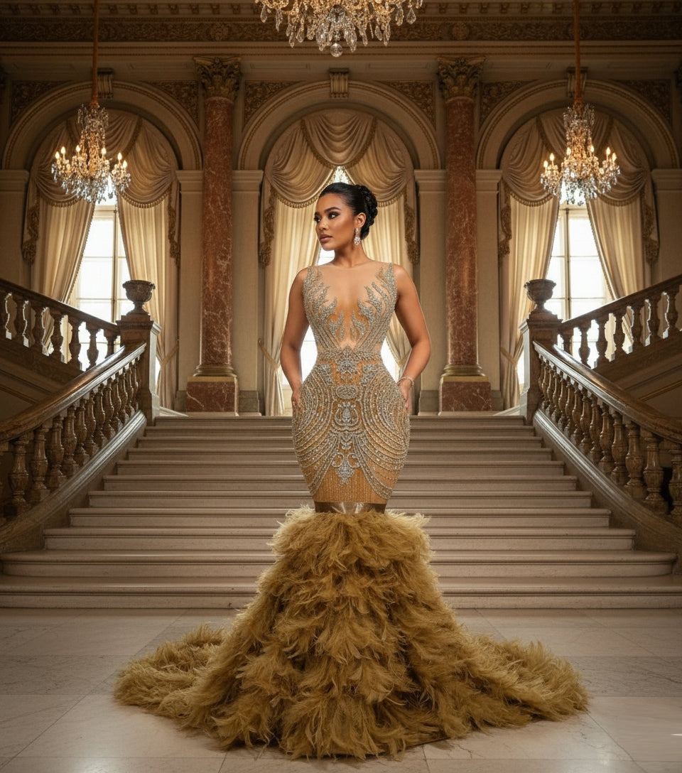 The combination of the sparkling rhinestone mermaid dress and the feather mermaid detailing gives this bridal gown a striking and luxury aesthetic, suitable for formal or red-carpet events.