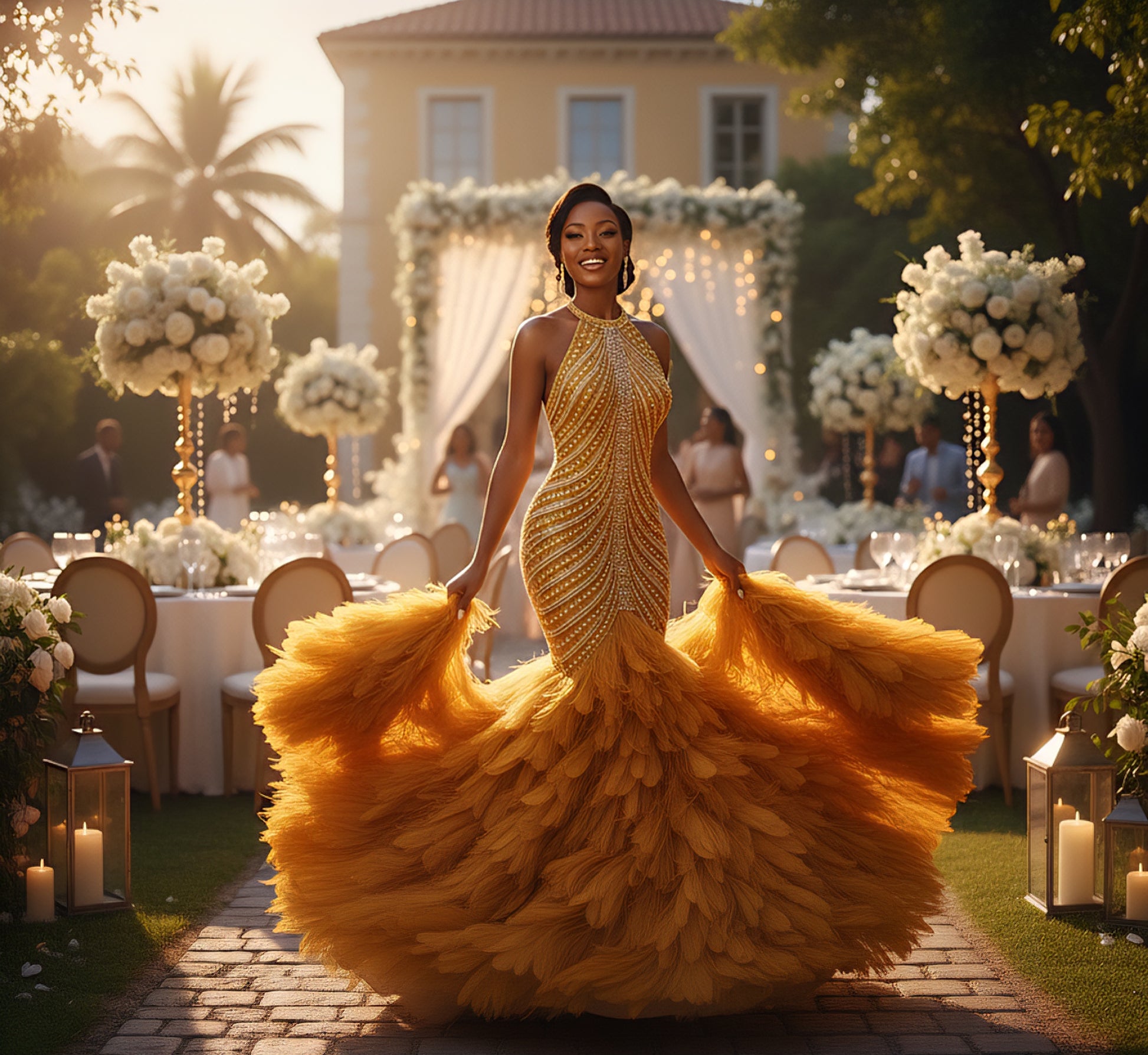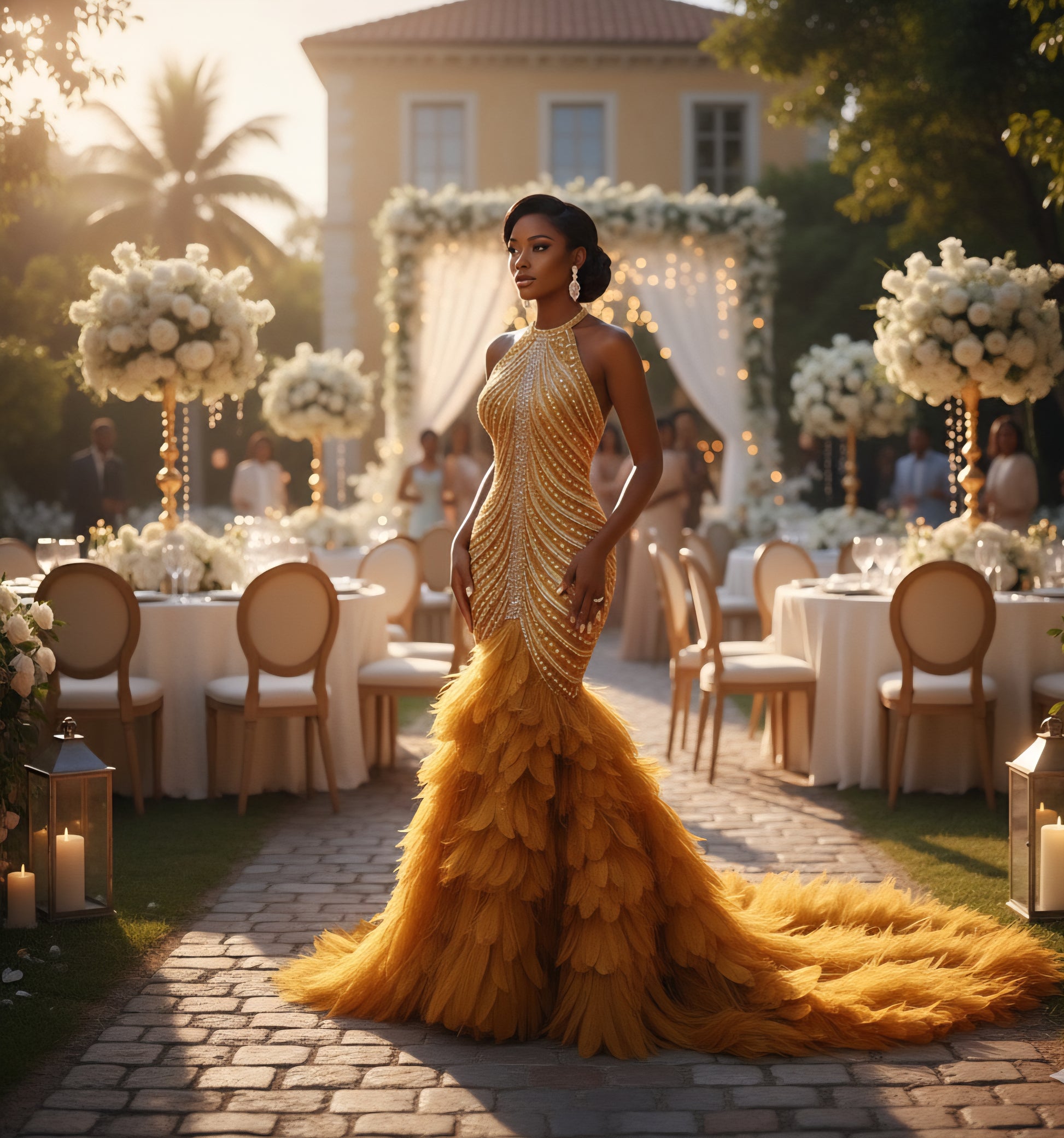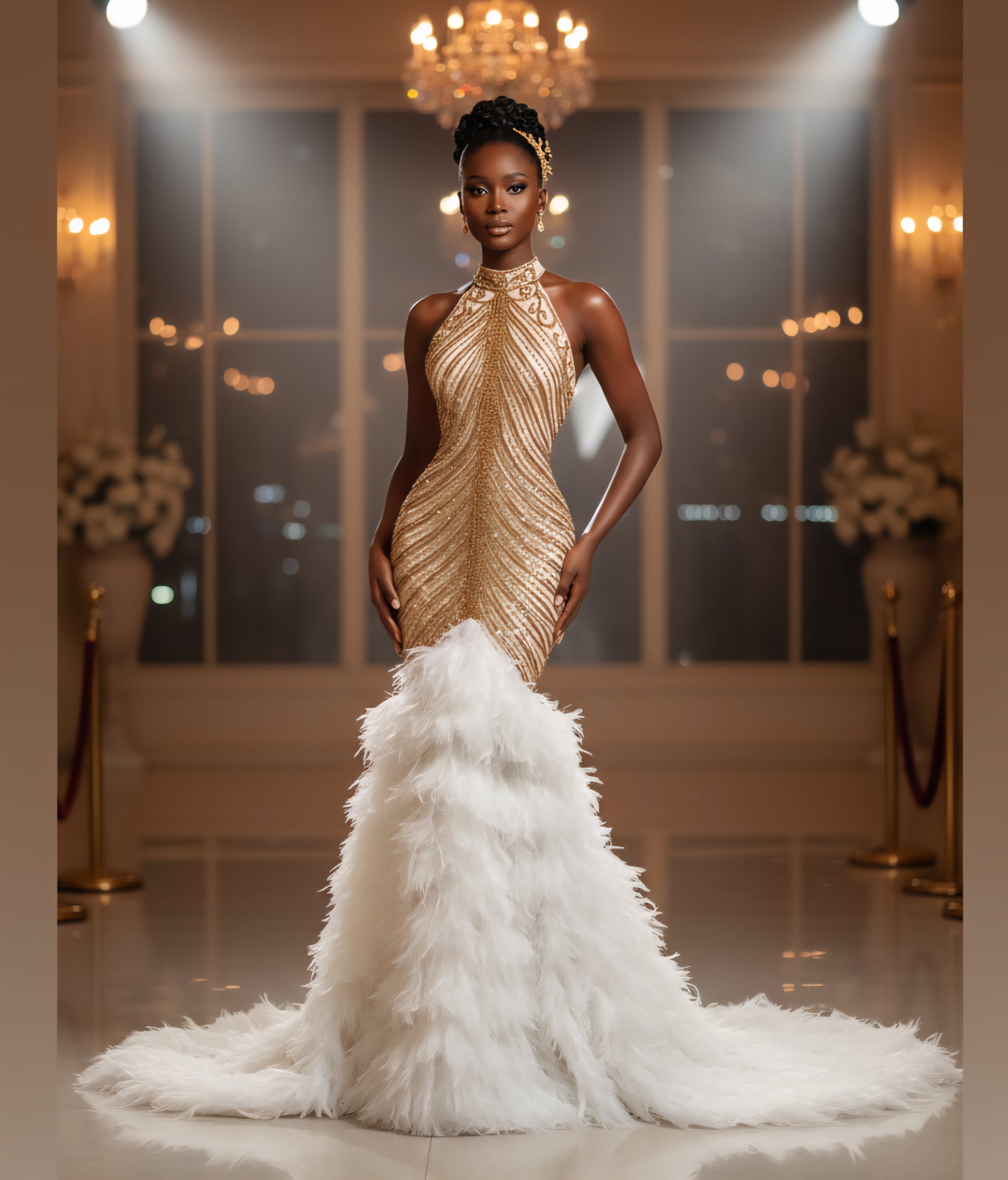 This magnificent winter wonderland gown features 83 inches of feathers, with a sheer rhinestone wedding gown material in the front and a high-quality solid fabric back, making it form-fitting for brides of all sizes. Available in various colors. The intricate golden rhinestone embellishments create a shimmering, elegant look, perfect for any wedding, red carpet event, or prom. This designer gown offers a luxurious appeal for women seeking a breathtaking statement.