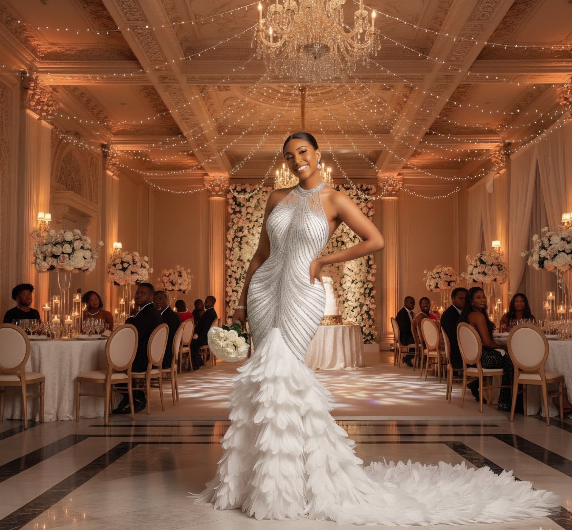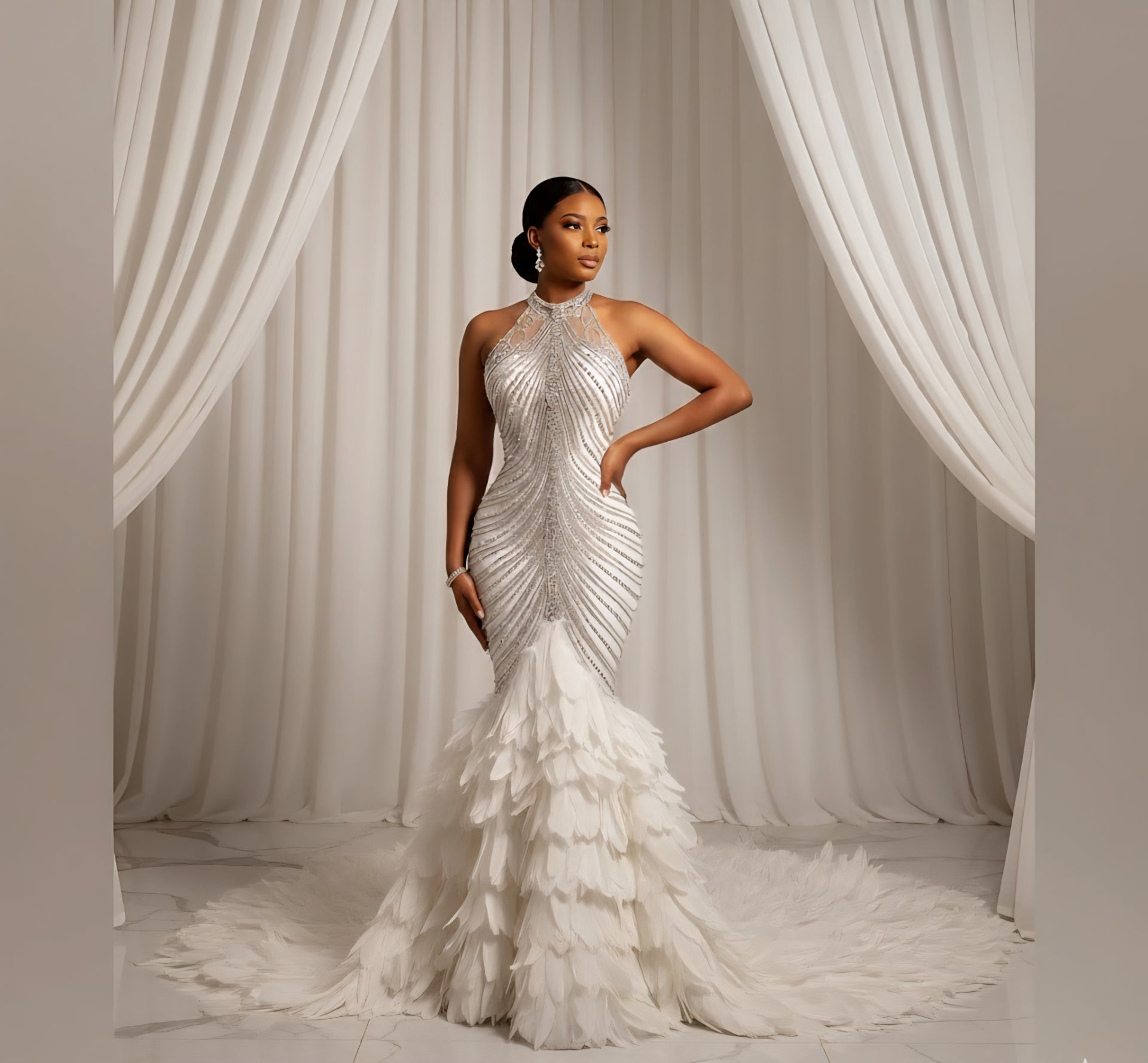 The dramatic mermaid silhouette enhances the beauty of this winter wonderland wedding dress, with layered feathers adding an opulent touch. The fusion of rhinestone details and feathers gives this bridal masterpiece a regal charm, making it a stunning choice for dresses in a luxury collection.