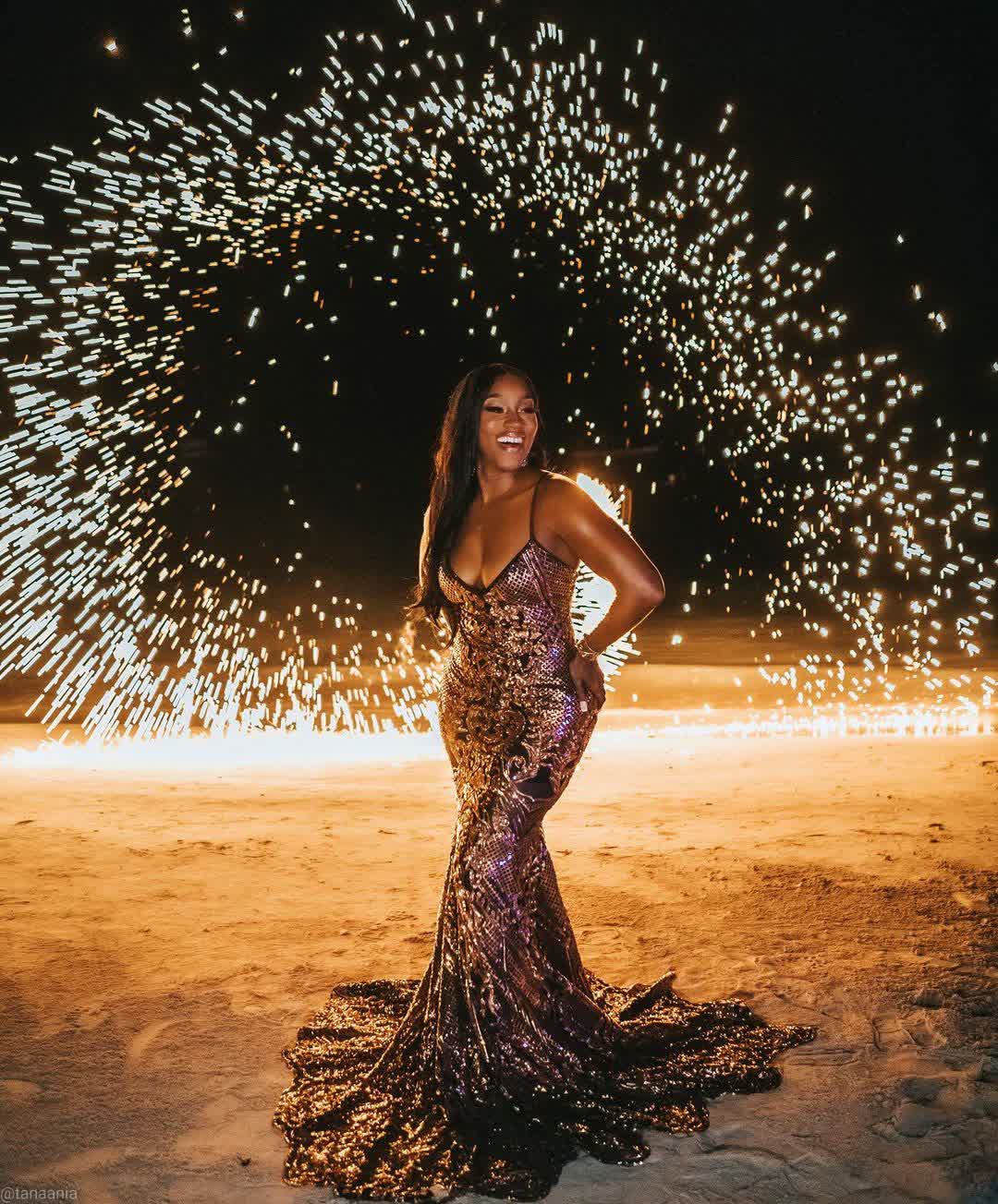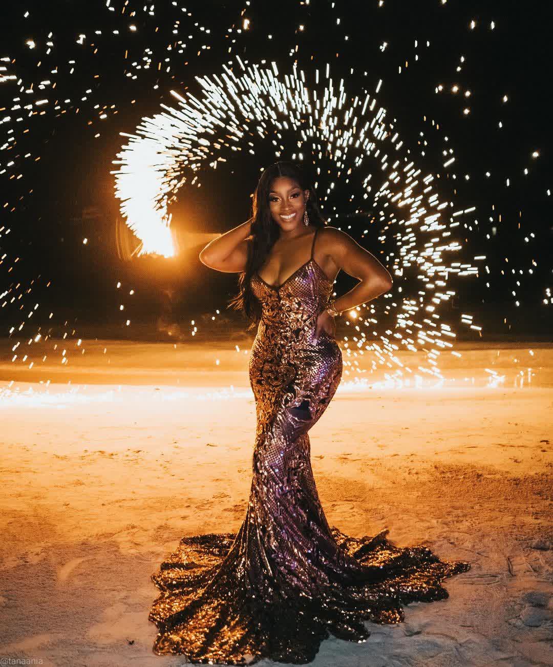 The dress hugs your curves in all the right places, creating a flattering silhouette that will have all eyes on you. The mesmerizing sequins catch the light beautifully, making this dress perfect for any special occasion.