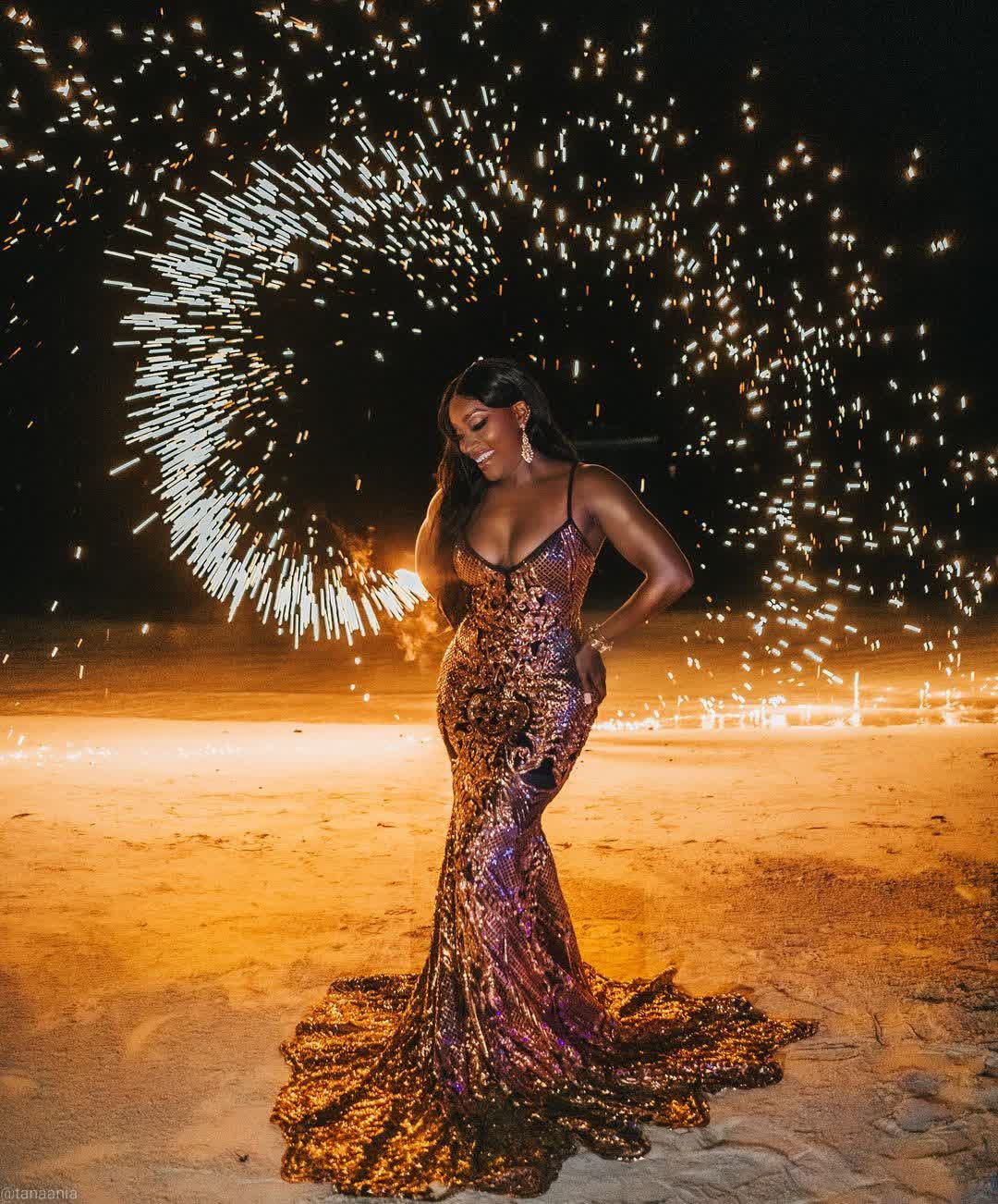 This stunning mermaid gown features delicate spaghetti straps and shimmering sequins that will make you feel like a true goddess.