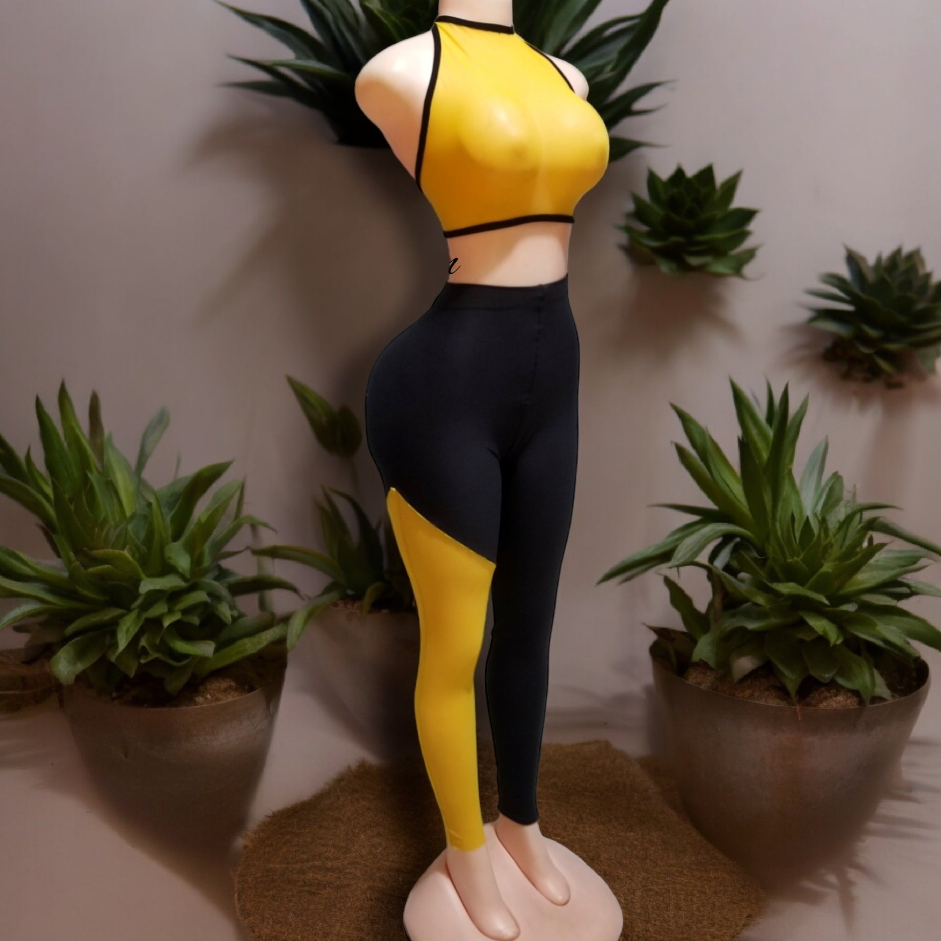 The set includes a crop top and leggings, perfect for any workout or casual day out. The bright yellow color paired with the bold black and yellow accents create a statement look that is sure to turn heads.