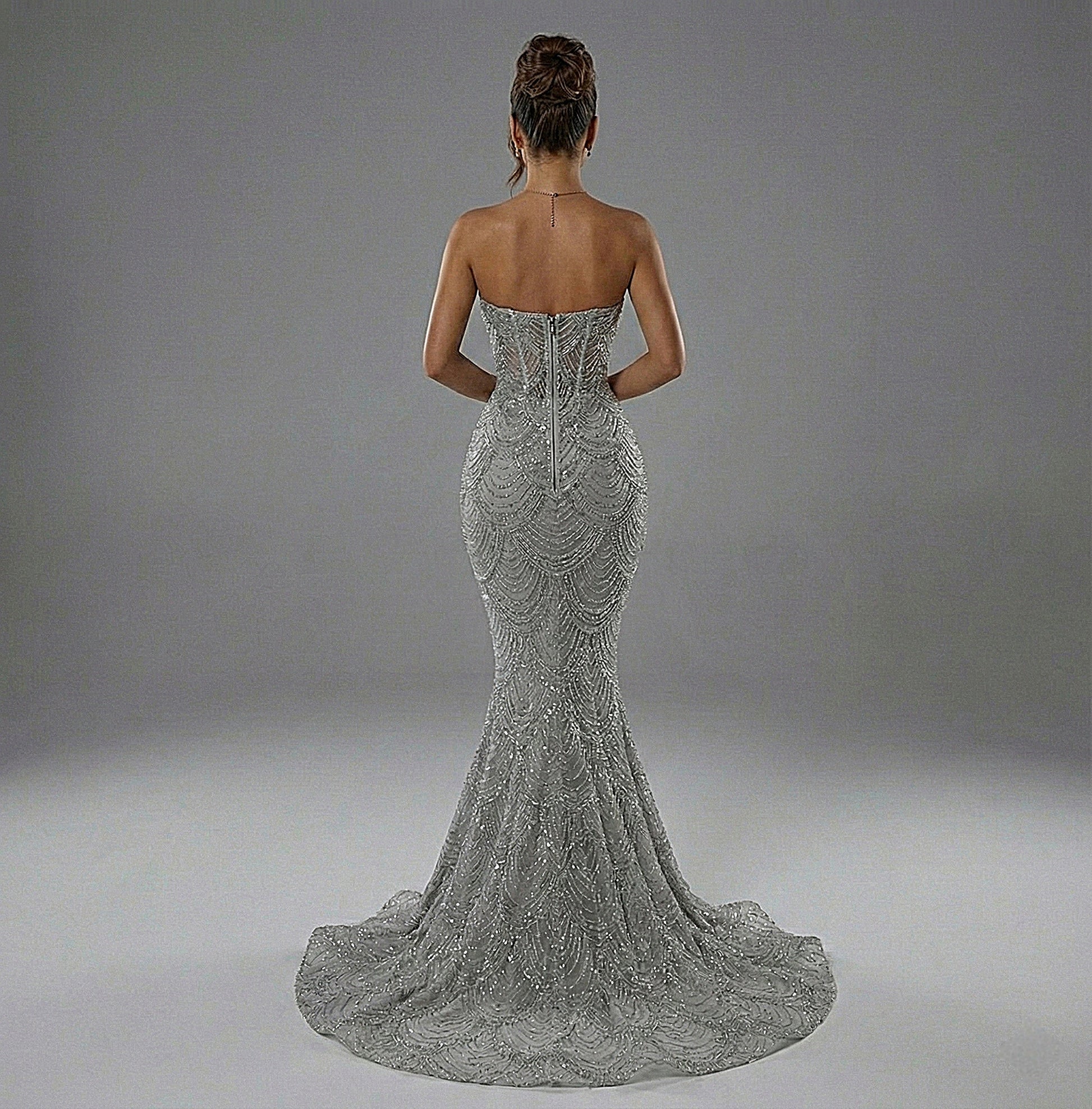 The "Scalloped" Beadwork: Inspired by the grandeur of the Art Deco era, the dress features thousands of hand-placed silver sequins and beads arranged in a cascading wave pattern. This creates a mesmerizing "liquid metal" effect that catches the light from every angle.