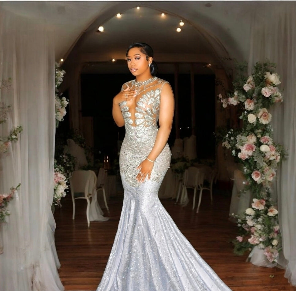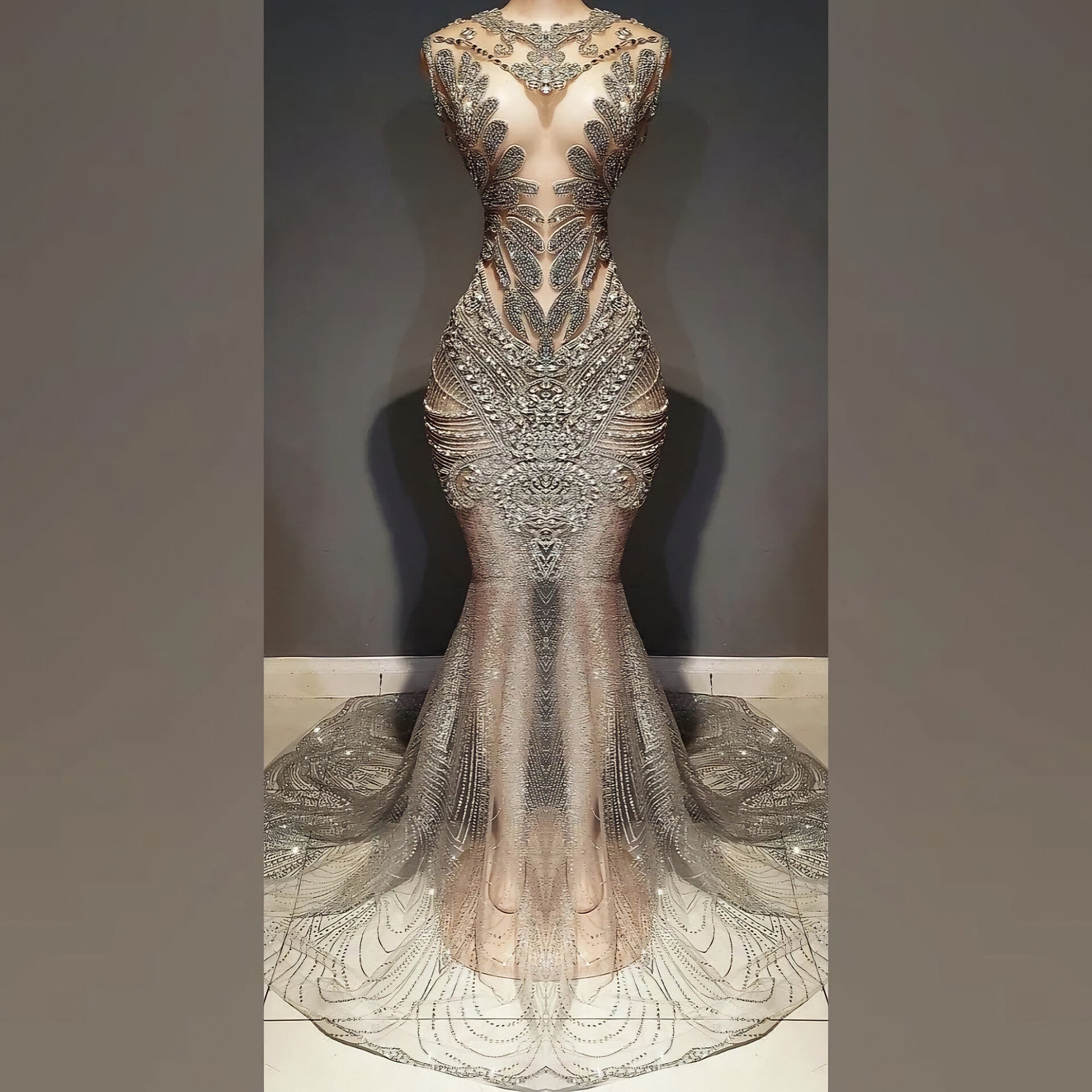 Shine like a star with our glitter sheer rhinestone mermaid gown.