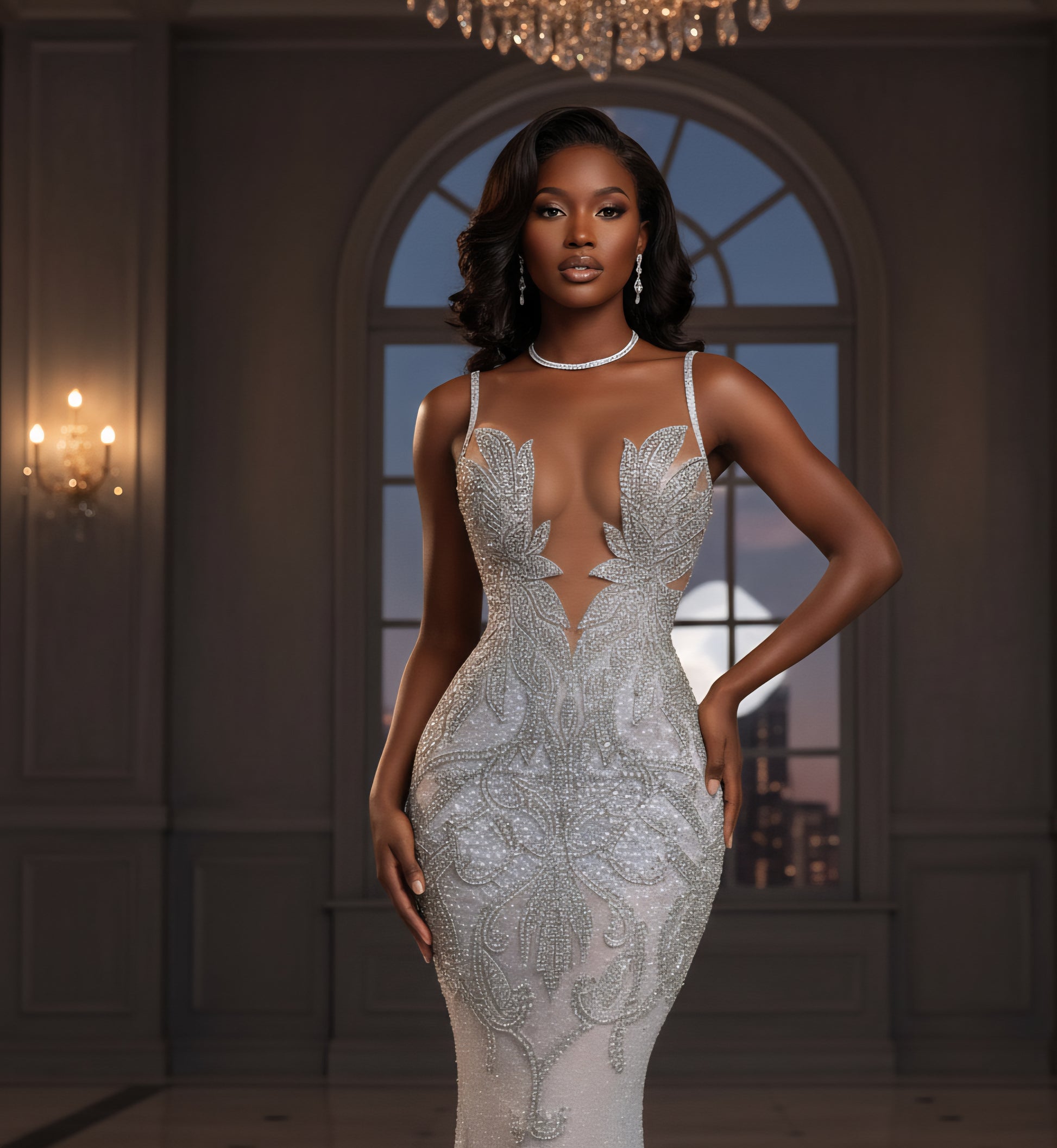 The fitted bodice transitions into a flared, floor-length train, characteristic of a rhinestone mermaid wedding dress, perfect for formal or red-carpet events. This designer rhinestone mermaid dress is ideal for brides looking to make a bold statement at wedding celebrations, galas, or high-end events.