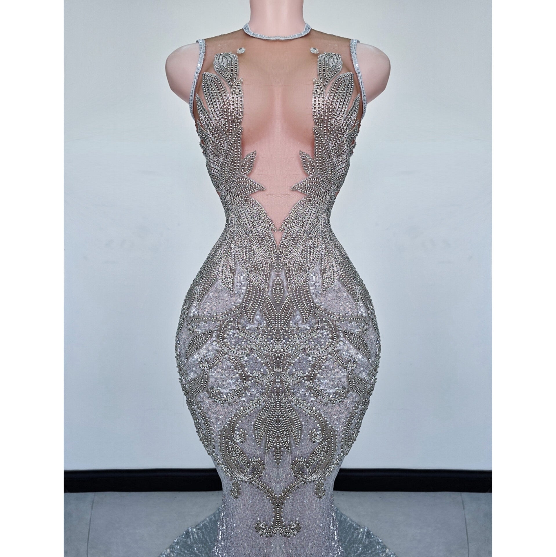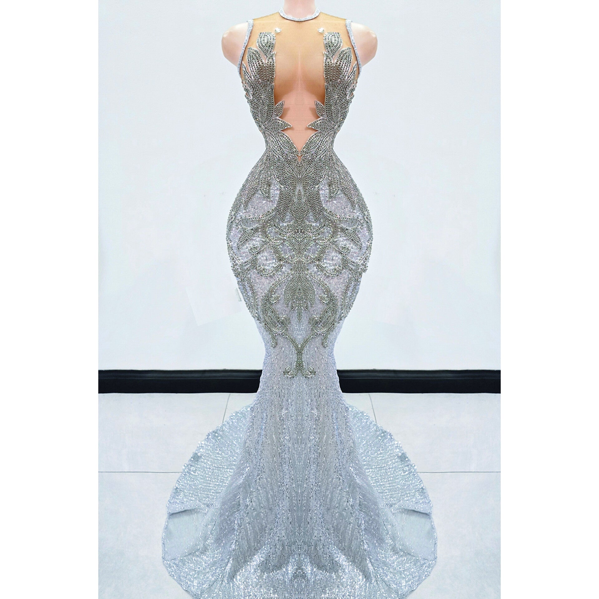 This elegant and highly detailed mermaid wedding gown features a striking silhouette. The Phayrah gown is encrusted with intricate silver embellishments, including rhinestones, creating a shimmering, luxury look. The pattern is symmetrical, showcasing a mix of floral and abstract motifs.