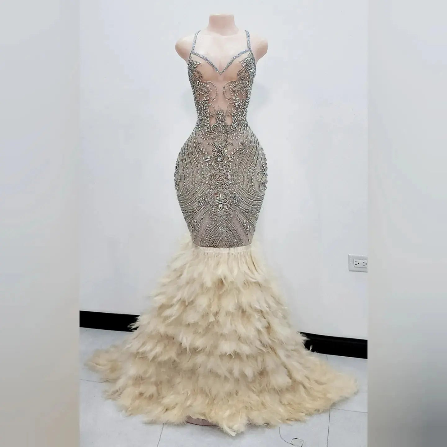 Vahalah Feather Mermaid Dress is made of a sheer glitter material with rhinestone at the front with a sweetheart neckline with straps that goes all the way to the back with a deep opening. Zips at the back as well. Clients have the option to put lining under the dress so its not see through, if lining is chosen dress will be lined to just above the knee.