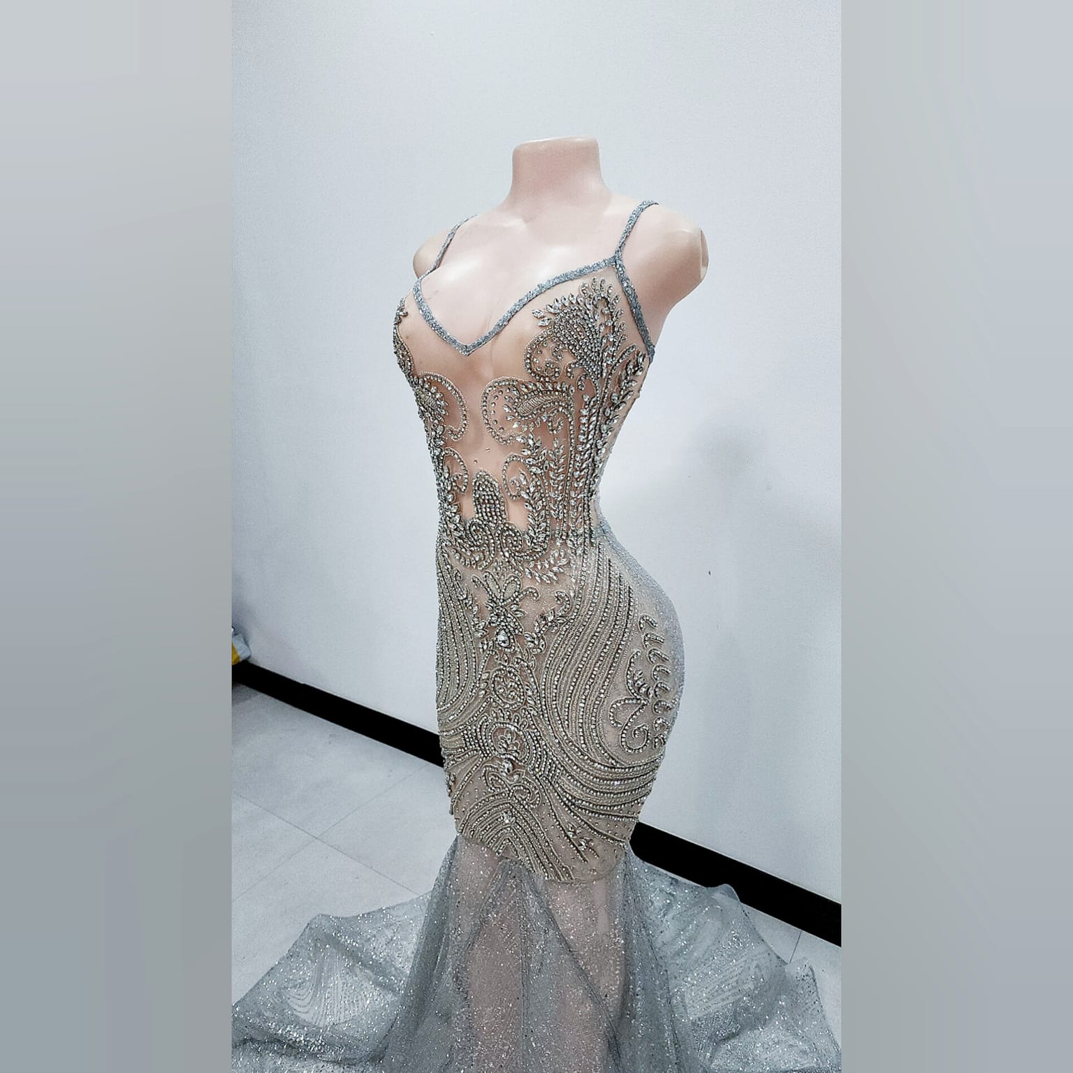 Vahalah Feather Mermaid Dress is made of a sheer glitter material with rhinestone at the front with a sweetheart neckline with straps that goes all the way to the back with a deep opening. Zips at the back as well. Clients have the option to put lining under the dress so its not see through, if lining is chosen dress will be lined to just above the knee.