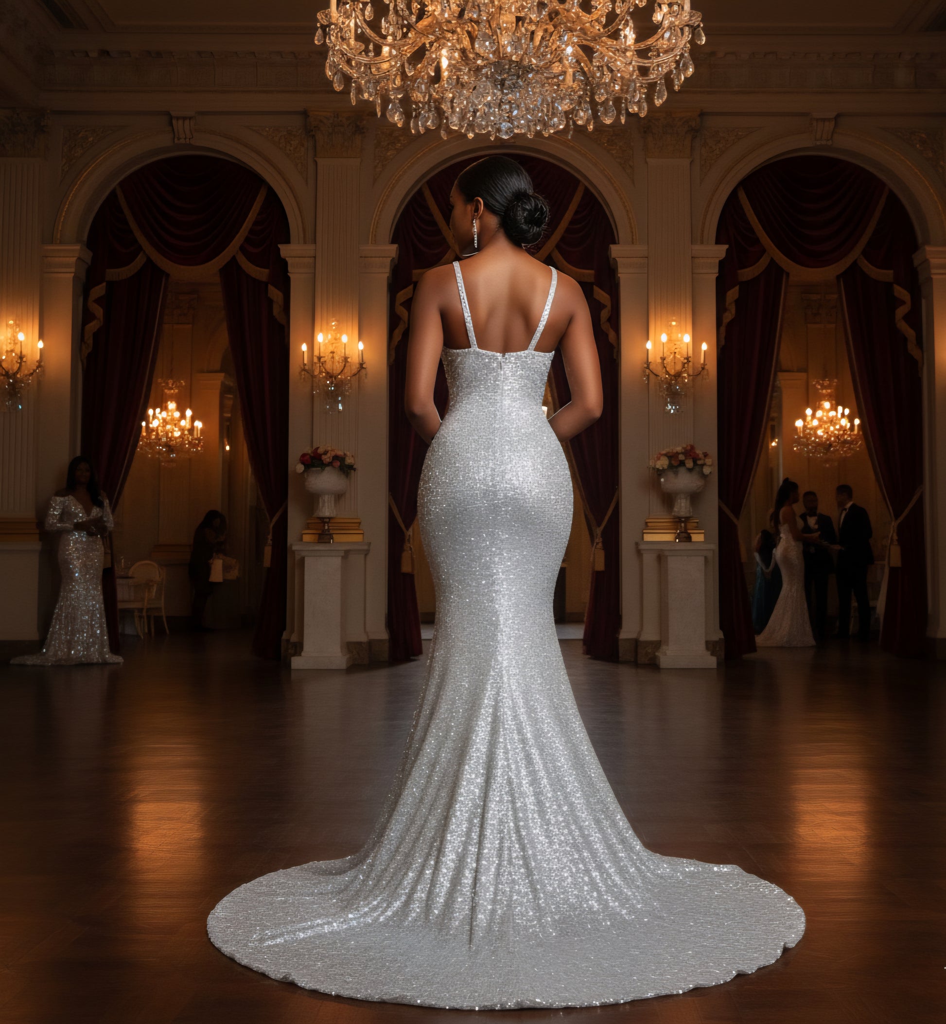 Fabric/Texture: The entire gown is made from a highly sparkly, sequined fabric, giving it an all-over dazzling, metallic sheen.